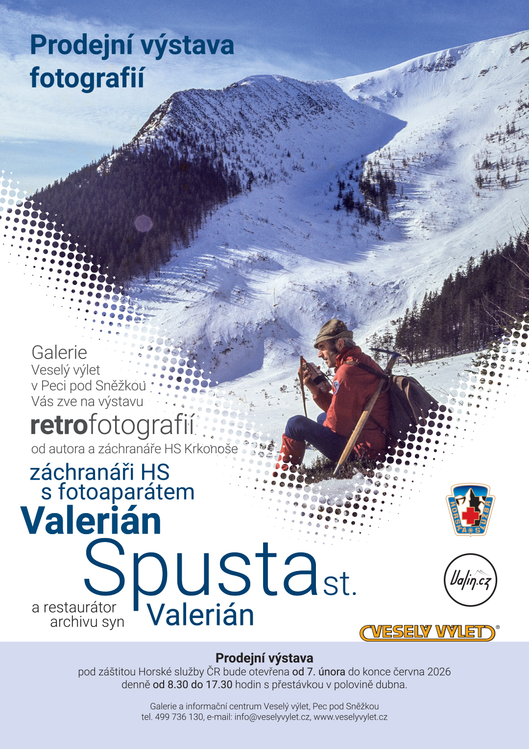 Představím výběr snímků mého otce, Valeriána Spusty st. (1932–2018), člena Horské služby, který dlouhá léta dokumentoval práci horských záchranářů v Krkonoších. Jeho fotografie zachycují atmosféru druhé poloviny minulého století, tehdejší dění v horách i technologický pokrok té doby. Nyní máte možnost vidět tyto jedinečné historické záběry ve velkých formátech.